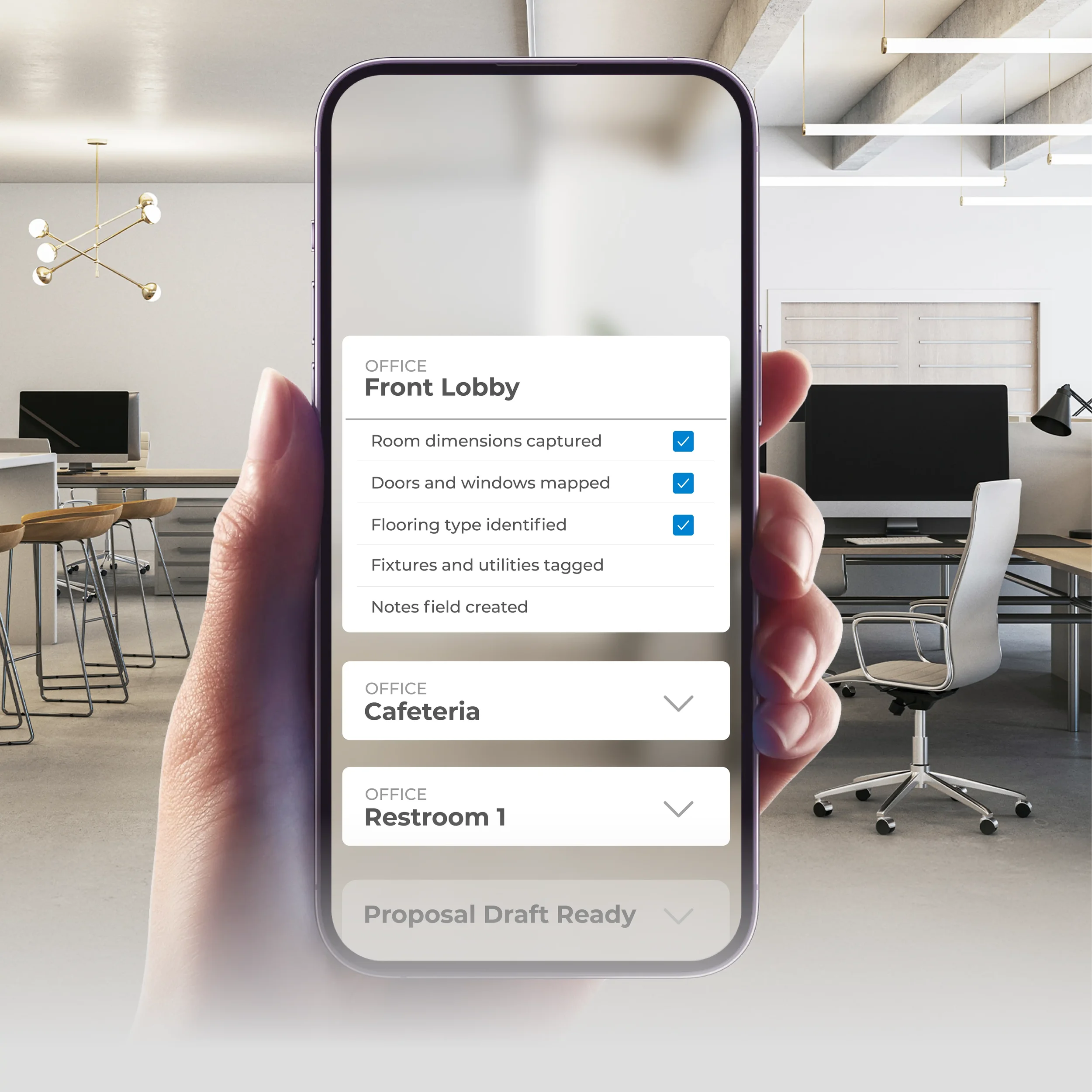 Areas, measurements, flooring, fixtures, notes, and photos – right on mobile.
